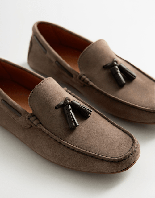 Ik open het pakje. Daarin zitten een paar geelbruincremekleurige mocassin-schoenen met kwastjes.